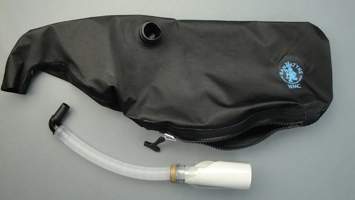 Bannatyne also makes a light-weight gore-tex type of bag in the same sizes as described above. These are essentially the same bag as the hybrid, but without the heavier faux-leather exterior. They also have the zip on the bottom rather than on the side. Though any moisture control system can be used with it, each light synthetic bag comes with a Bannatyne bottle/tube watertrap which can be hemped and inserted into the bottom of the blowstick stock. You will be asked to choose from four sizes available — extended small, Willie McCallum custom, medium or large.