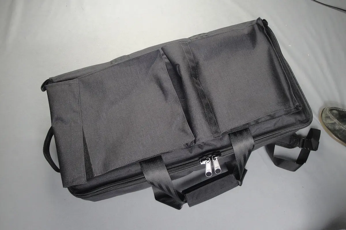 Measuring 24” x 12” x 6”, these totes come in traditional hand-carrying style, or as a backpack. Two storage pouches on the top are roomy enough for spare canisters, maintenance kit and a music book. The carry style comes with a removeable shoulder strap for easy carrying.