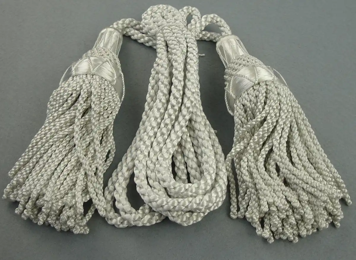 Rayon (know as “silk”) drone cords in silver. Each set of drone cords comes with a set of 8 appropriately coloured cord ties.