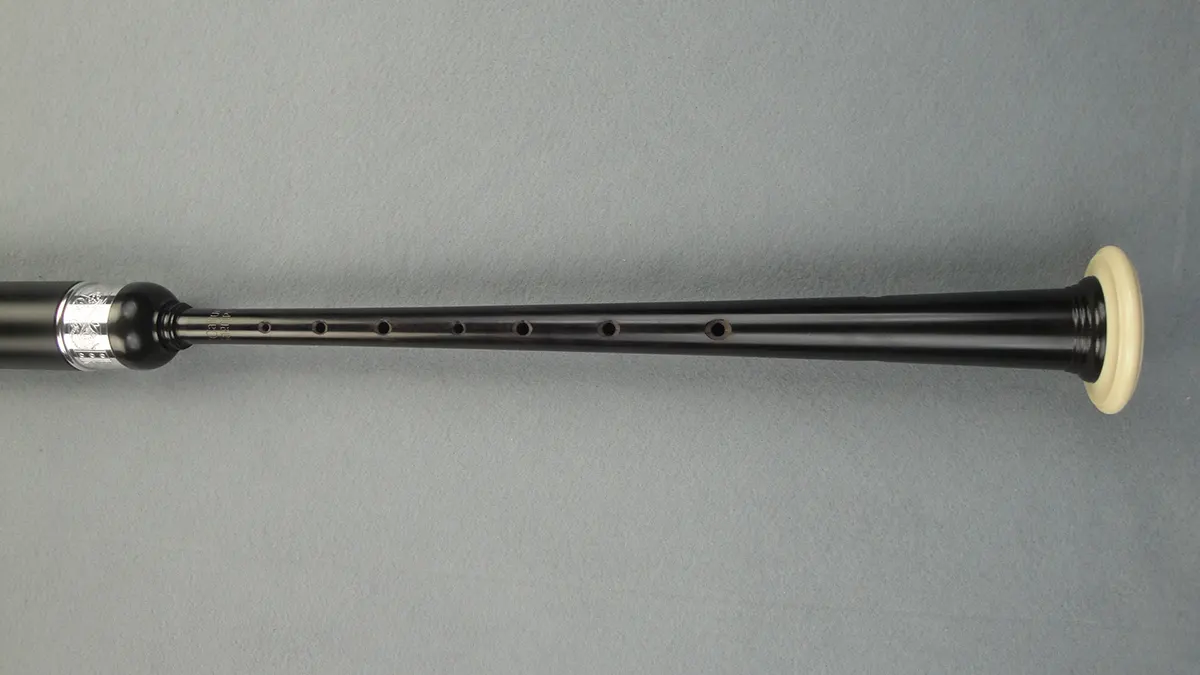 This McCallum PC9 is ‘long’ spacing — the same as the pipe chanter. The ferrule is nickel with a Celtic pattern, and the sole is imitation ivory. The practice chanter top is plastic to prevent cracking due to moisture.