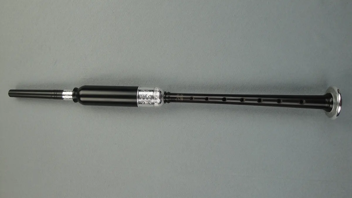 McCallum makes African blackwood practice chanters that are lovely both to look at and to play. This PC7/FN is ‘regular’ length (shorter than the pipe chanter hole spacing) with a Thistle engraving pattern, which you can view closely by clicking on the image at left. The ferrule, bowl, sole and bottom of the mouthpiece are all engraved nickel. The chanter has a watertrap installed in the top piece. Turn the chanter upside down to empty. The practice chanter top is plastic to prevent cracking due to moisture.